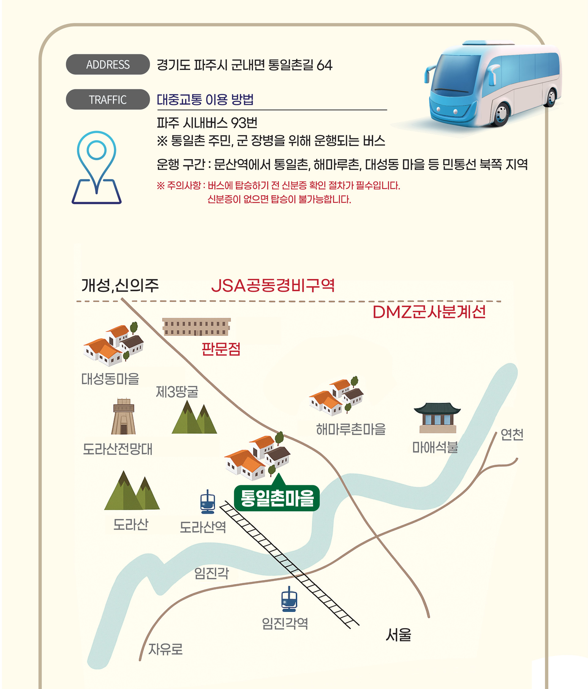 ※ 통일촌은 민간인통제구역(CCZ) 안에 있으므로 입장 전 반드시 신분증을 지참하고,